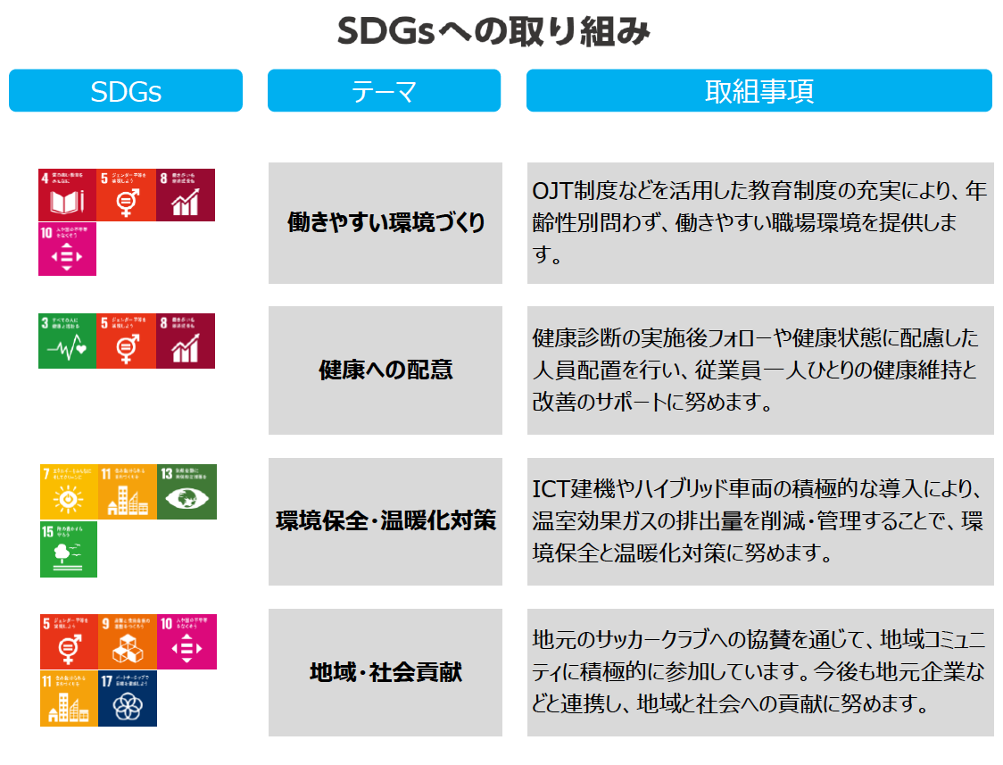 | 主要取引先 | 株式会社上組 徳山支店 株式会社上組 福山支店 JFEシビル株式会社 大成建設株式会社 株式会社トクヤマ ◆公共事業 公益財団法人広島県下水道公社 広島県 福山市 防府市上下水道局 山口市 ※五十音順で記載しております。 |